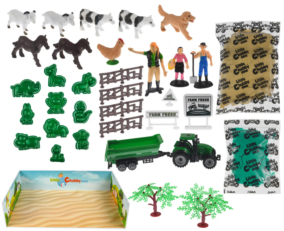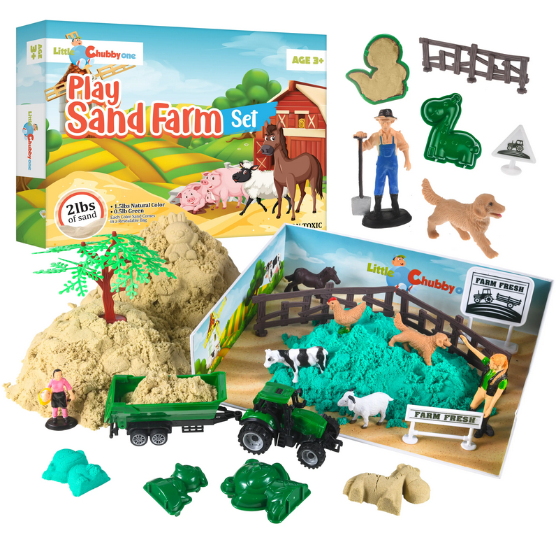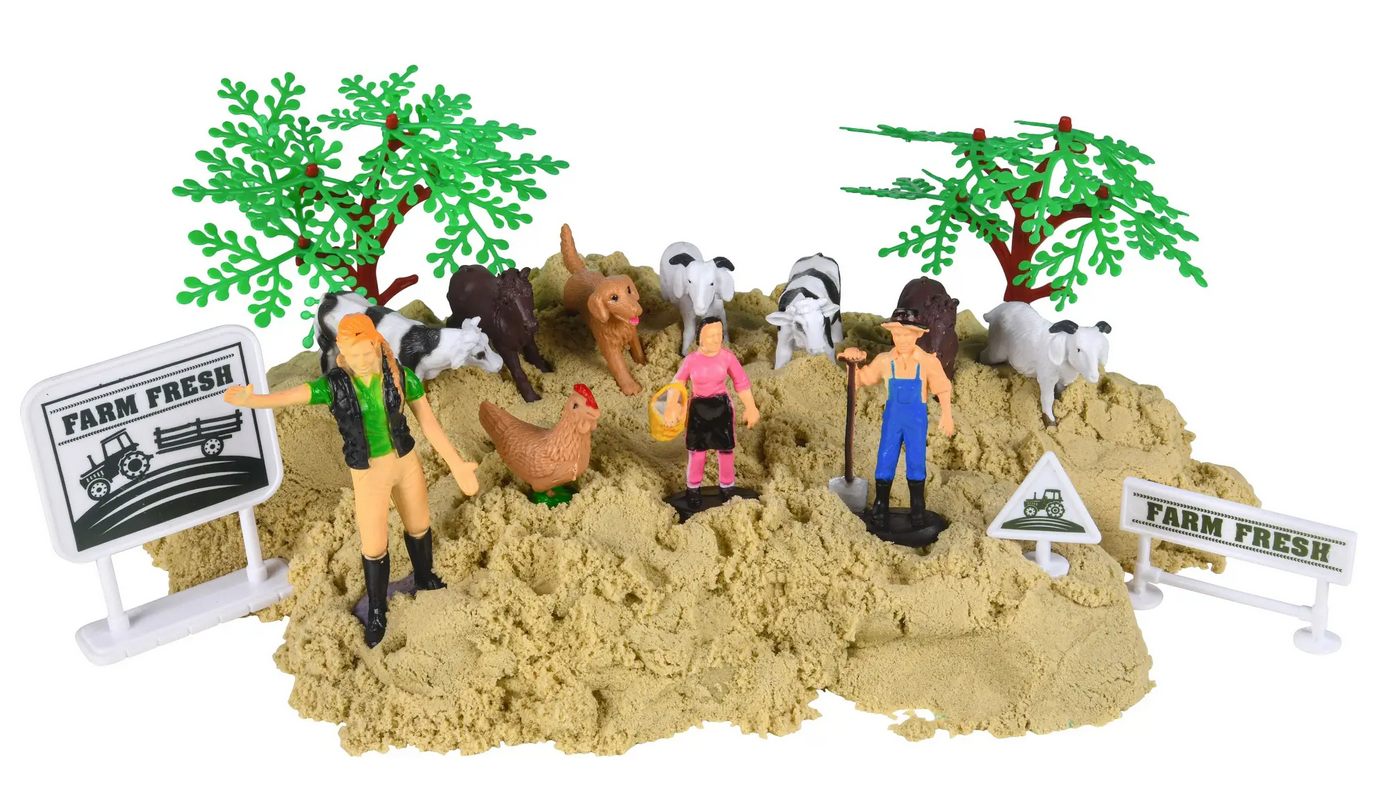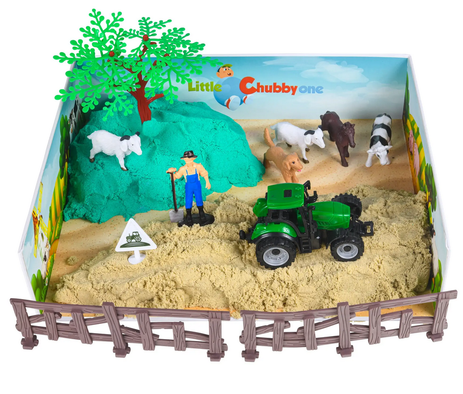Lek i sanden Gårdsett for kreative barn som vil lage sin egen gård! Dette settet kommer med 1kg giftfri sand i grønne og naturlige farger som er enkel å forme uten søl.